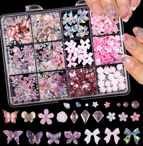 12グリッド混合3Dカラー樹脂弓ハートフラットバックダイヤモンドネイルアートデコレーションネイルチャーム